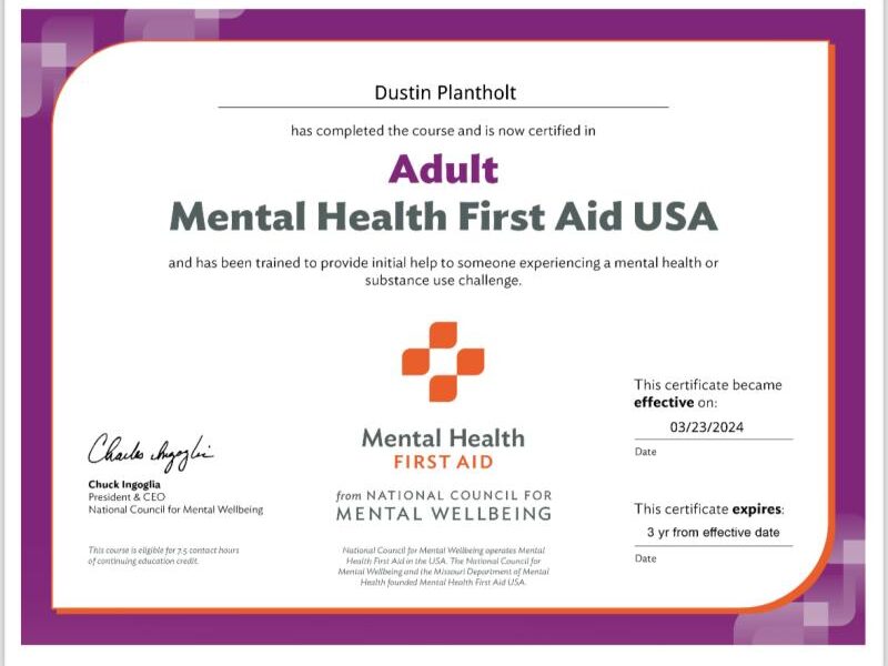 Dustin Plantholt has officially completed his certification in Mental Health First Aid, a program designed to equip individuals with the tools to offer initial support to those experiencing mental health or substance use challenges.
