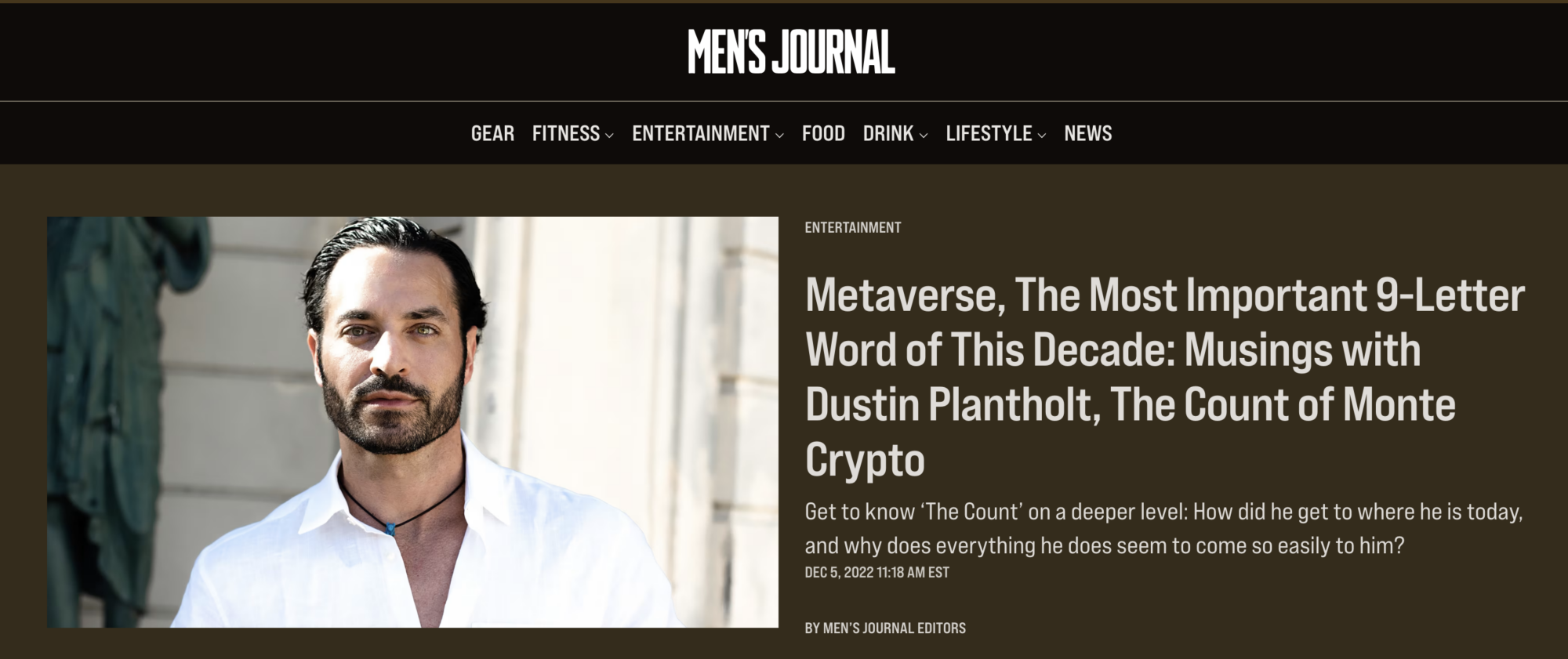 In February 2023, Men’s Journal published a feature titled “Musings with Dustin Plantholt, The Count of Monte Crypto.” The article offered readers an inside look at Dustin’s philosophy, personal journey, and the values that shape his work in media, Web3, and digital innovation.